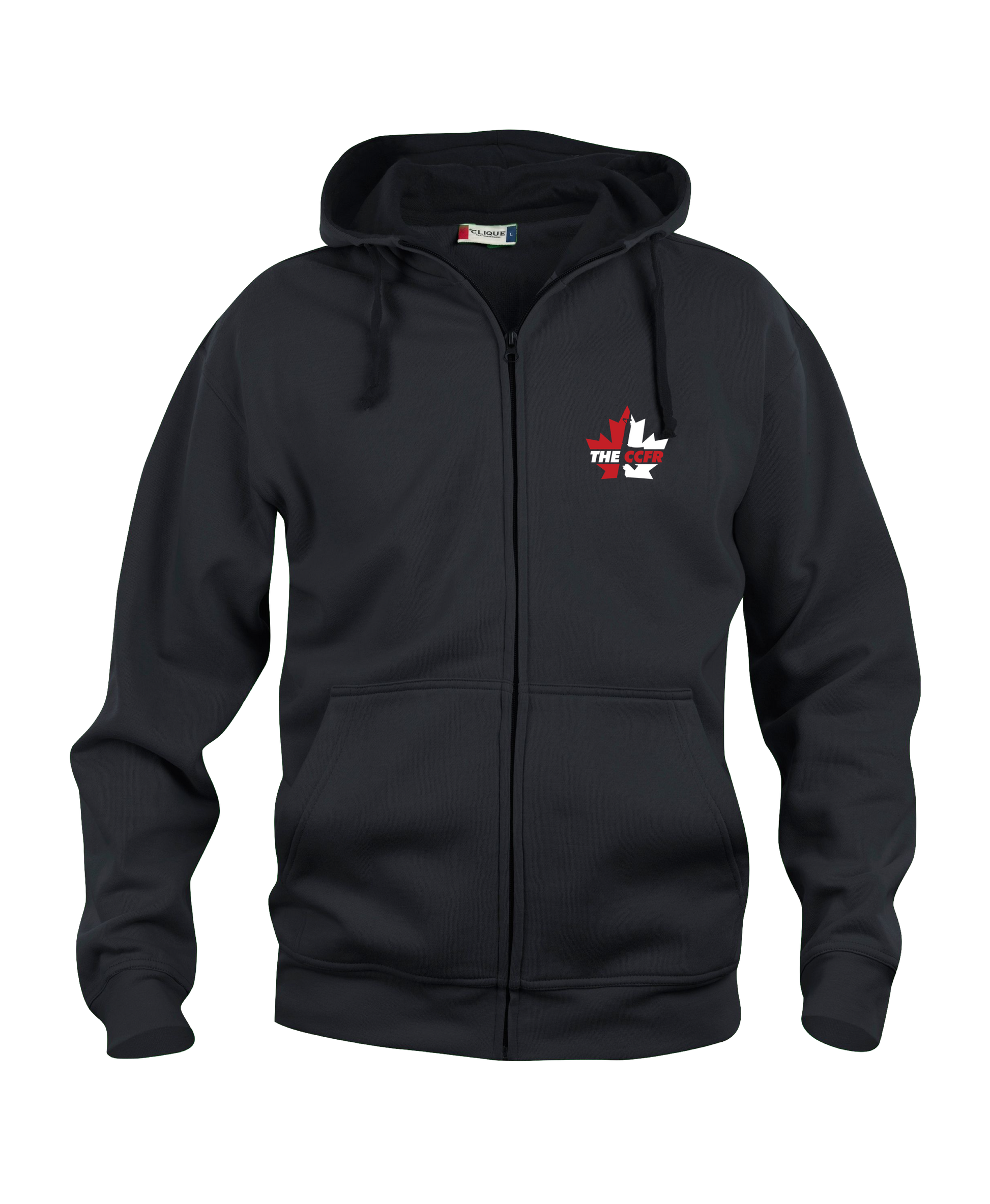 Full-zip hoodie with embroidered CCFR logo in Black. These premium hoodies are 35% pre-shrunk cotton & 65% polyester.