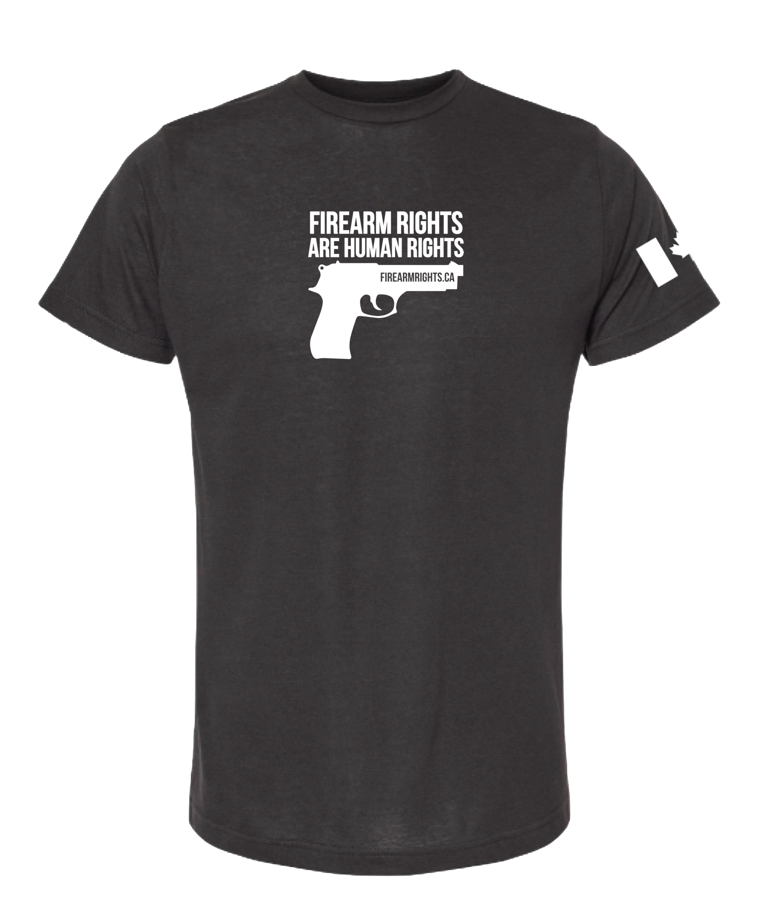 Firearm Rights are Human Rights! Wear it, live it, believe it! This super soft tee features a handgun graphic, our bold logo and the Canadian flag. Support the CCFR and make a statement.